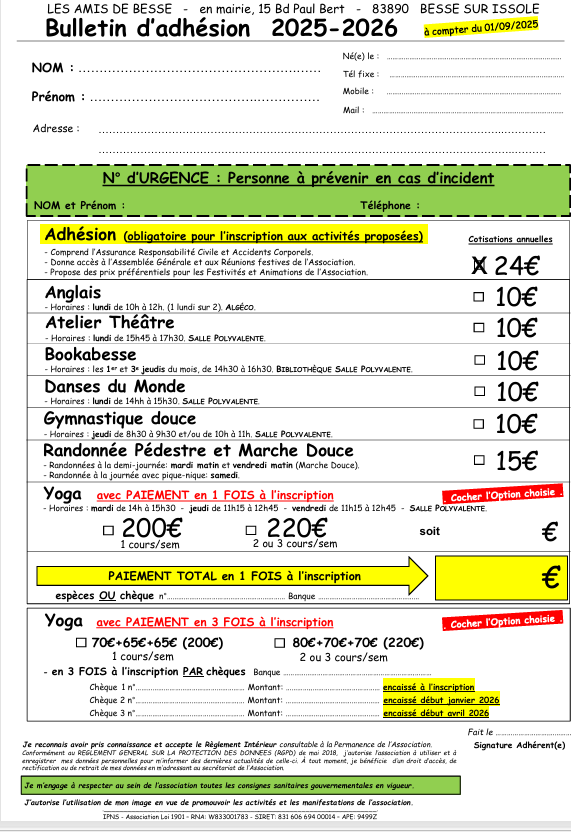 . plus 3 chèques avec les montants correspondant à l'abonnement que vous avez retenu (1 cours/sem, 2 ou 3 cours/sem ). Le 1er chèque sera encaissé à l’inscription, le 2ème en janvier 2026 et le 3eme en avril 2026.