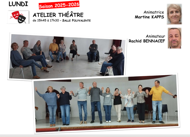 L'atelier Théâtre est co-animé par Martine Kapps et Rachid Bennacef , qui partagent leurs compétences dans différents domaines en s’adaptant au mieux aux désirs et besoins de chacun, dans un climat de rire et de bien-être.
